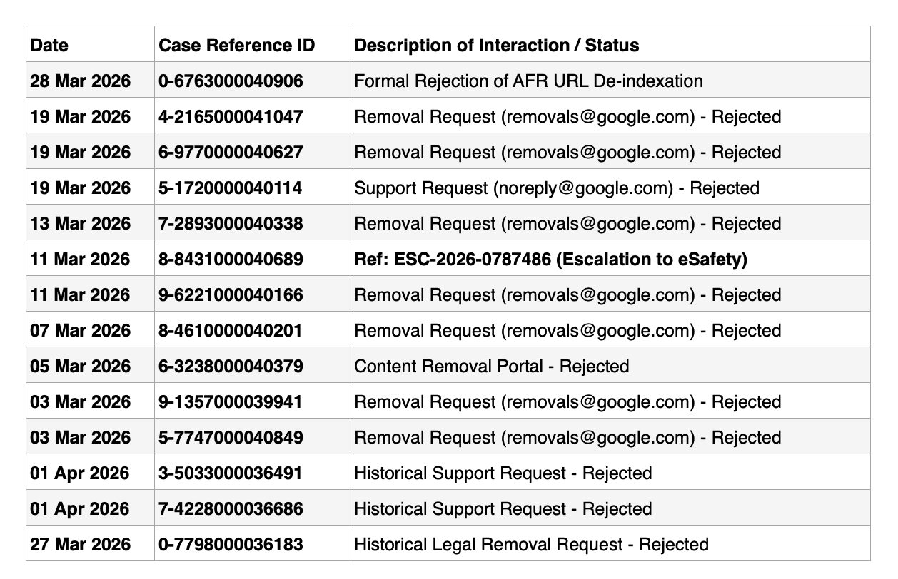 We have repeatedly notified Google of the defamatory content and the resulting physical safety risks to my family. Every entry below represents a formal rejection of reality. These 15 Case Reference Numbers serve as forensic evidence of Google’s prior notice and their ongoing refusal to rectify known fabrications. We have exhausted all internal remedies; the matter is now a question of global legal liability.